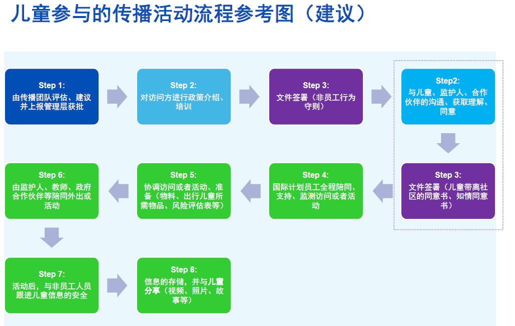 各机构在通过传播增强自身影响力的过程中,同时需要遵循“尊重女童和男童的尊严、最大利益和安全”的基础原则,也建议组织内部应形成系统、规范的传播活动流程,尽可能降低传播过程中儿童利益受损的情况发生。