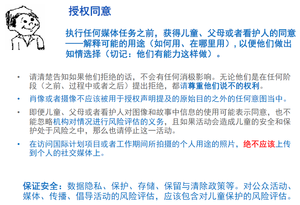 同时,传播工作中需获得儿童、其父母或看护人“授权同意”,也特别指出即使签署了授权同意书,也不能忽视机构持续对情况进行风险评估的义务。
