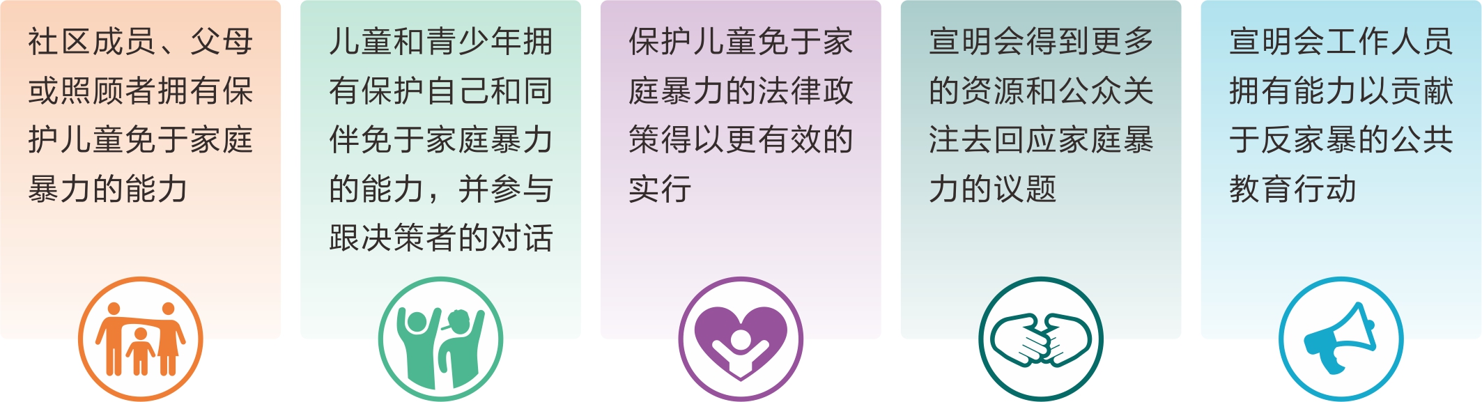 世界宣明会在中国聚焦于“终止针对儿童的家庭暴力”,在未来五年从以下5个方面,与合作伙伴同行,一起开展“童享零家暴,世界更美好”行动,期望中国的男孩和女孩能在积极和关爱的环境里成长,免于家庭暴力的威胁。
