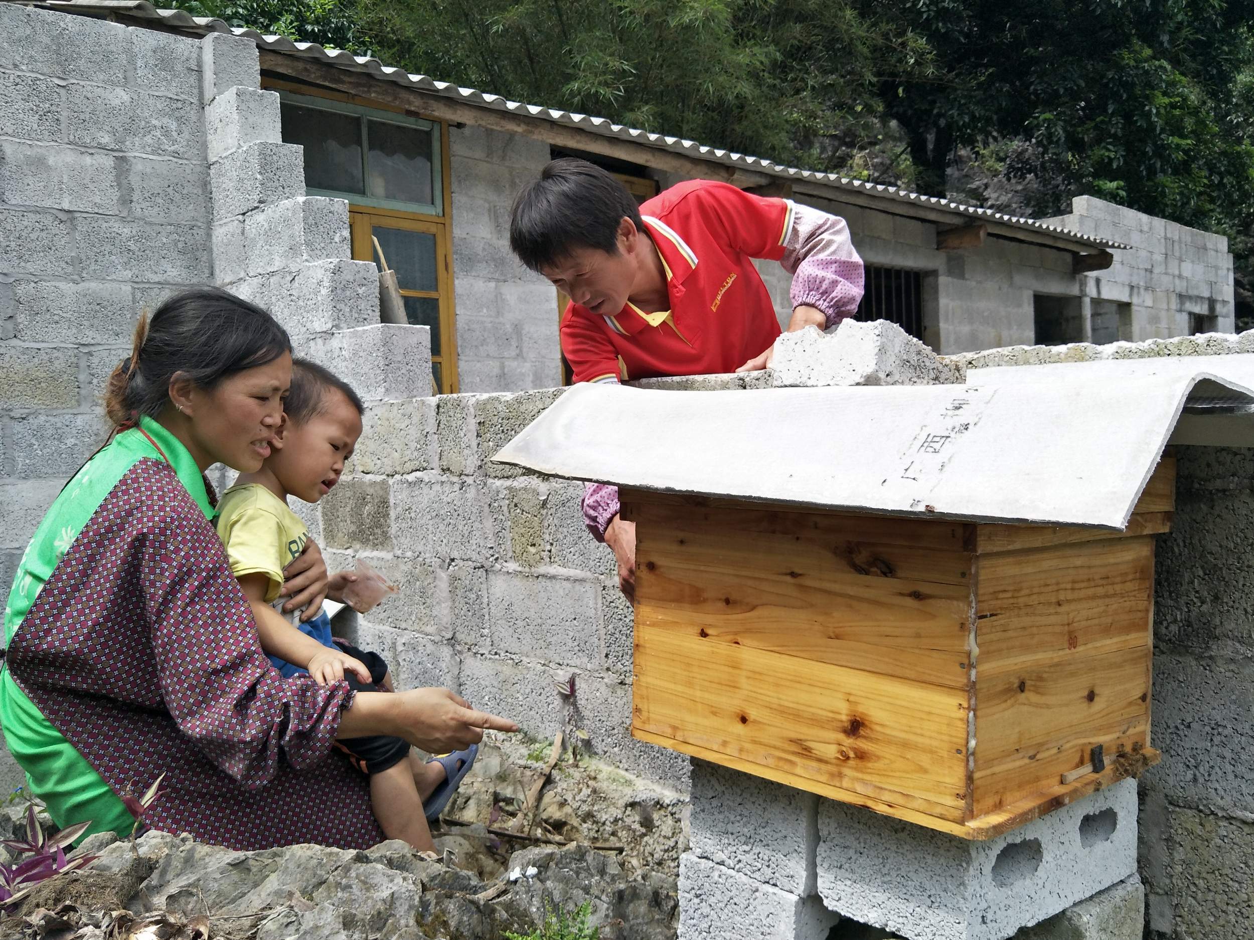 他把蜂箱放在半山上,也就是他家房子的后面(房子倚靠着一座大山),只有空闲时才会去看一眼。吉全有6个孩子,目前还有5个在上学,为了维持家庭生计他除了参与宣明会的生态种养殖项目,还会在农闲时打一些零工,孩子们的妈妈则到县里打工,薪水补贴家用,所以吉全没有太多的精力照看蜂箱。