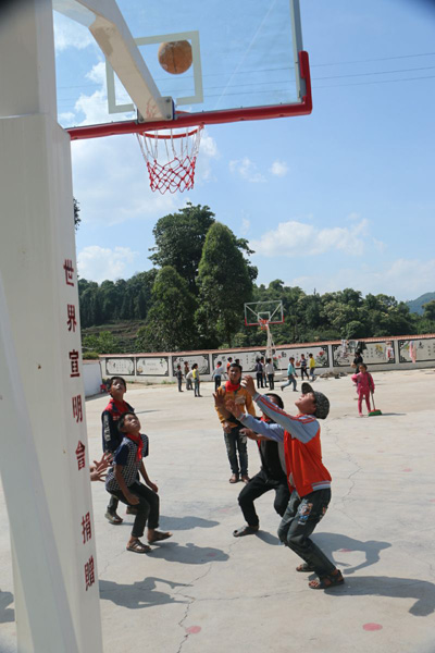 交谈中,小文说:“我们学校的球场是好的,我们很喜欢打篮球,但是球架很破旧,球板也是破旧的木板,以前老师换过新的球板,可时间长了球板又慢慢的变坏,打球时还经常掉木板碎片下来,老师看到了后害怕我们被木片砸伤就不敢给我们打球。现在球板和球圈都掉了,我们才敢在球场上打球和玩耍,可打球也是对着没有球圈的空球板投篮,这样好没意思……小文继续说:“我们老师也在考虑重新买一套质量好的球架来更换坏的球架,但听老师在校会上说,因我们村小的经费紧张,一下子无法解决篮球架购买。” 男孩的眼里划过淡淡的忧伤。