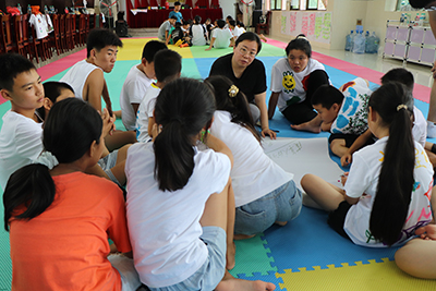 “这个游戏叫空谷回声,它把参与者从外部一步步带入到对自己的观察,最后要面对自己,感受自己和关注自己,这是夏令营第一阶段要完成的事情。在这个阶段,我们通过游戏,让孩子先建立与自己的联系,去觉察他们自己内在需要。这个阶段主要培养孩子自我的觉察和省察能力,进而让他们具备问题意识,即有能力清晰地觉察到问题的存在,而且能够追溯问题产生的原因。第二个阶段的重点是让孩子建立与他人以及外部的联系。在这个阶段,我们设置很多团体游戏,并在游戏过程中教导孩子怎么进行沟通表达,如何与他人共同形成一个团体的共识,如何决议等等。孩子们在这个阶段得到沟通、表达、社交、领导力等团队合作能力的训练。第三个阶段,其实就是一个行为改变的阶段,或者叫共同行动的阶段,而这个共同行动可以是不同层面的,既可以是个体行为的改变,也可以是群体行为的改变。这是我们使用戏剧的方式带领孩子全程参与、发现他们自己的需求,然后自己去设计、回应这些需求的行动的完整过程。”寇薇分享道。