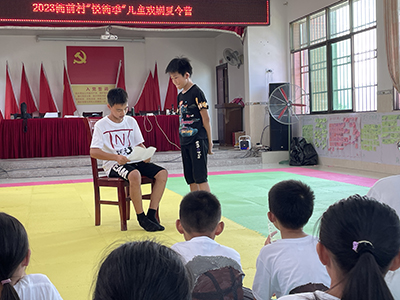 8月19日晚,儿童戏剧夏令营结营晚会在镇政府篮球场举行。孩子们向村子里的大人表演了他们自编自导自演的剧目《“爱”的教育》和《“温暖”的校园》,孩子们的出色演出赢得了观众的阵阵掌声