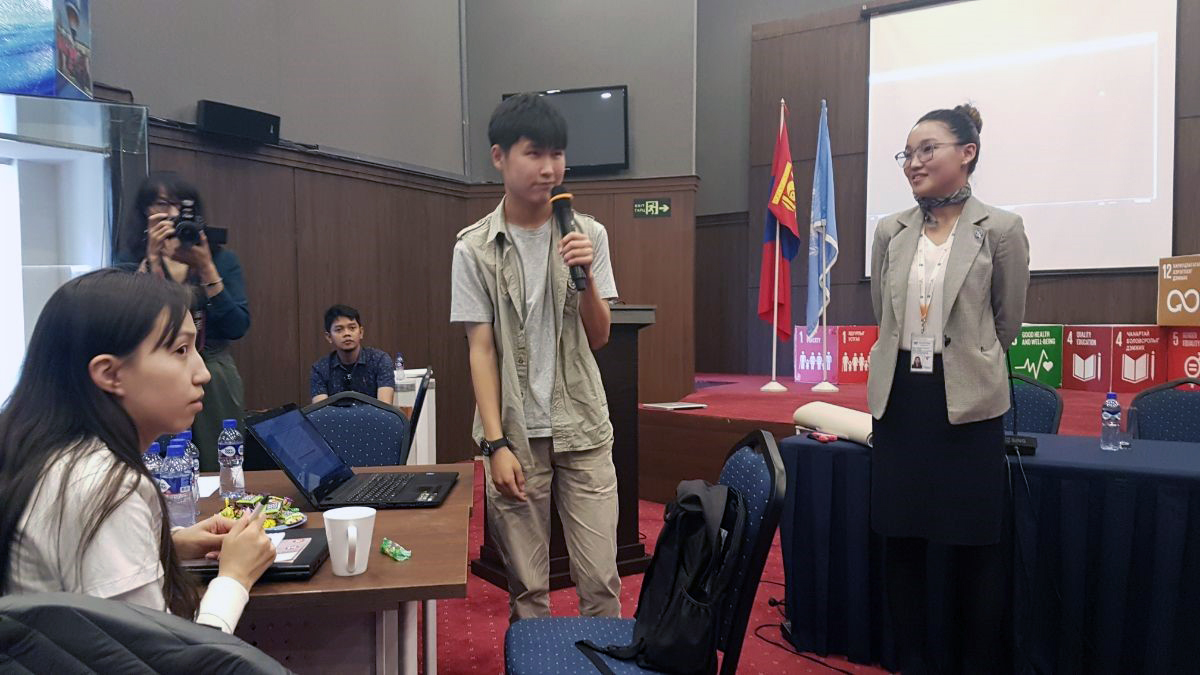 Khanbogd Tsengel,17岁,作为世界宣明会的儿童代表在会议上分享道:“儿童也需要具备在灾害中相互帮助的能力。为此,我们的青少年救援俱乐部给儿童教育和分享如何预防灾害、降低灾害风险的知识和技能,例如,在地震、火灾或水灾的时候如何应对及帮助他人。