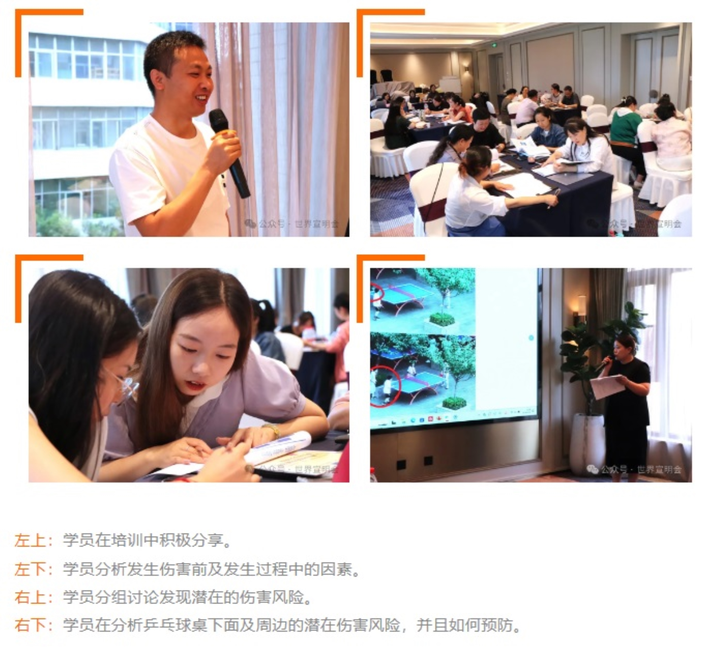 全球儿童安全组织(中国)的专家顾问崔老师通过学员在实践练习中拍摄的图片,着重提醒在儿童非故意伤害预防中,要关注有残障的儿童。例如,如果视障儿童或大人碰到了石墩子跌倒,而刚好此时有车辆行驶过来,那么儿童的遭遇就雪上加霜,很大机会出现道路交通伤害。因此,这些潜在隐患必须改进。这样的讲解,发人深醒,打开了培训参加者的视野,特别是对残障儿童在儿童非故意伤害预防中的特殊需要。